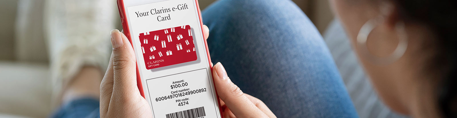 On Clarins.com, select "Add a Gift Card" during the payment step. Enter your e-gift card number and PIN code. If your e-gift card doesn't cover the full amount, you can cover the remaining balance with another form of payment.